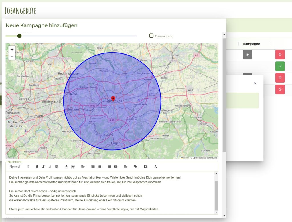 Ab sofort wird digitale Berufsorientierung noch konkreter: Mit der nagelneuen FUJOUR-Funktion können Ausbildungsbetriebe Kampagnen starten und gezielt Schüler:innen aus ihrer Region einladen, die wirklich zu ihren Ausbildungsangeboten passen, entweder in kleiner oder größerer Anzahl.