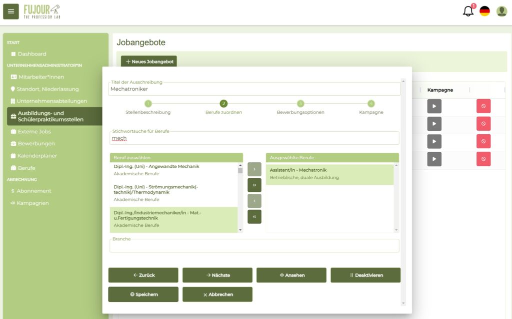 Ab sofort wird digitale Berufsorientierung noch konkreter: Mit der nagelneuen FUJOUR-Funktion können Ausbildungsbetriebe Kampagnen starten und gezielt Schüler:innen aus ihrer Region einladen, die wirklich zu ihren Ausbildungsangeboten passen, entweder in kleiner oder größerer Anzahl.